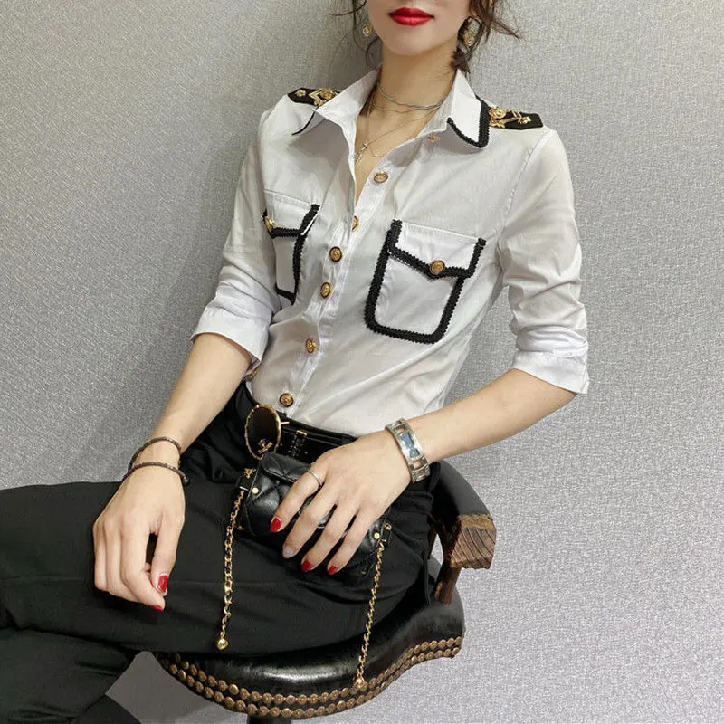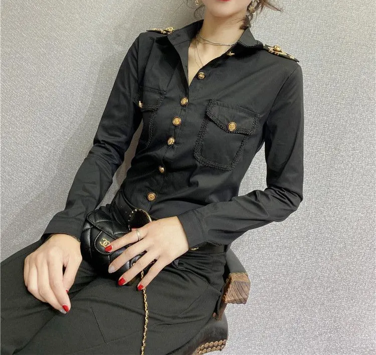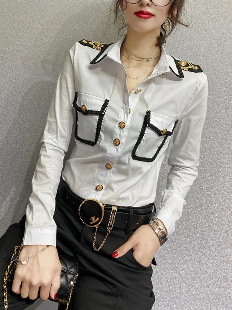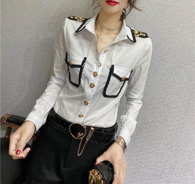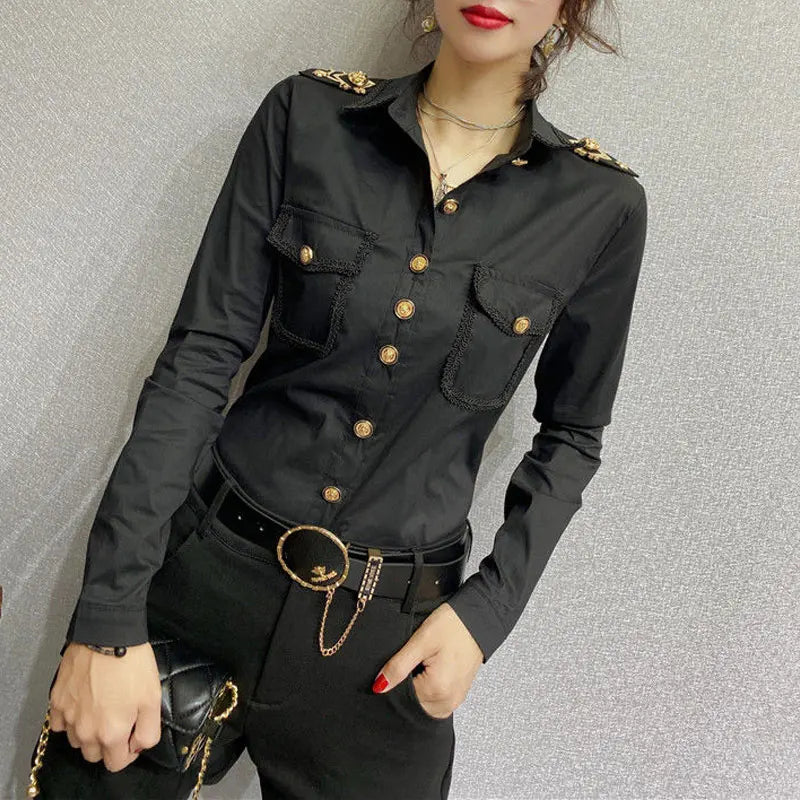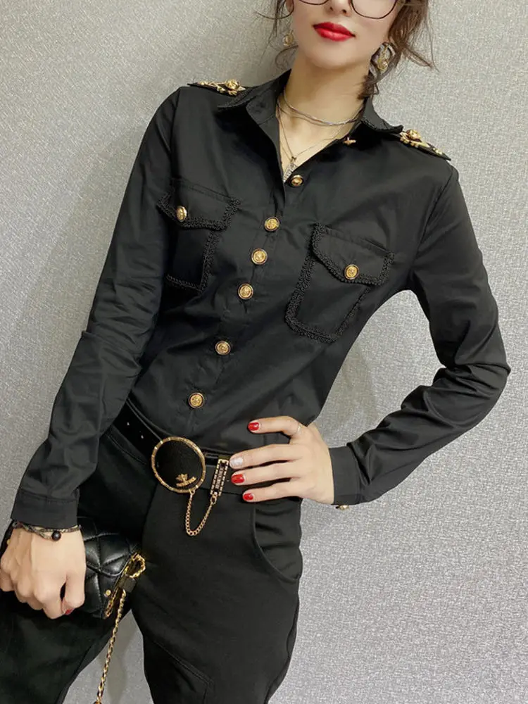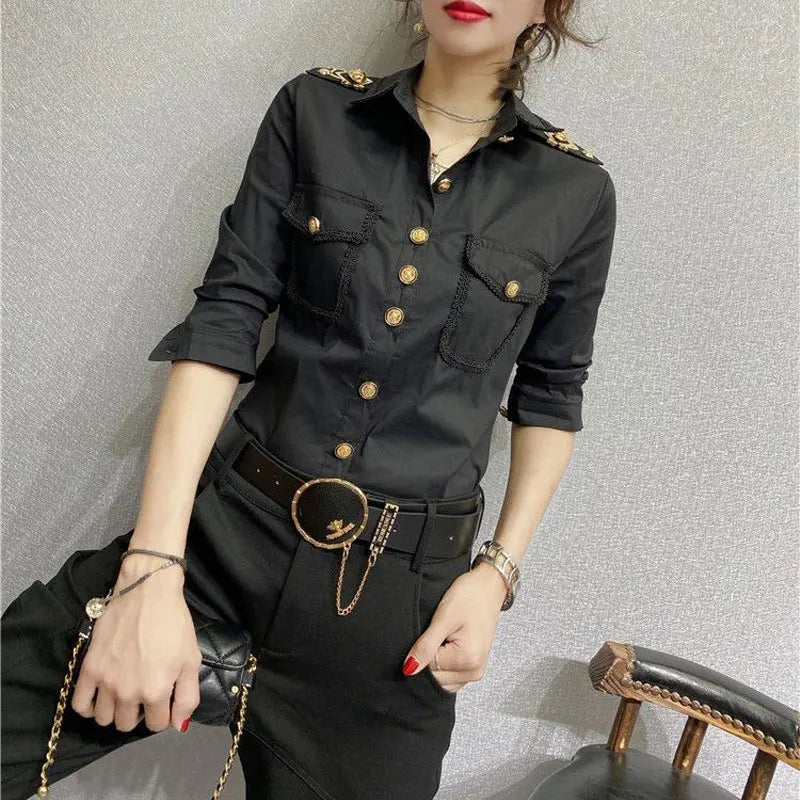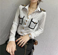 Streetwear Fashion Epaulet Shirt Spring Autumn Chic Single-breasted Women's Clothing Solid Color Bright Line Decoration Blouse